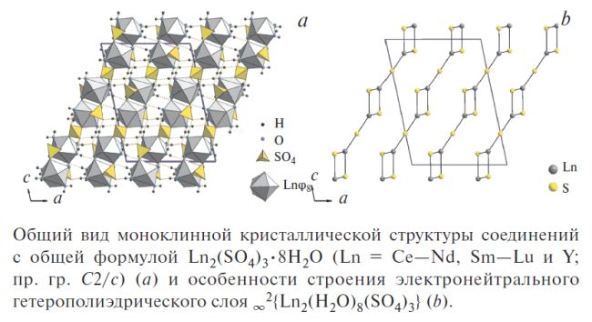 Монокристаллы сульфатов редкоземельных элементов с общей формулой Ln2(SO4)3•8H2O с Ln = Ce—Nd, Sm—Lu и Y получены при растворении оксидов или перекристаллизацией сульфатов из 20%-ной серной кислоты. Кристаллические структуры определены методом РСА. Соединения кристаллизуются в моноклинной элементарной ячейке, пространственная группа С2/с, a ~13.4—13.7 Å, b ~6.6—6.9 Å, c ~18.0—18.5 Å, β ~102.1—103.1°. Основу структур составляют электронейтральные гетерополиэдрические слои ∞2{Ln2(H2O)8(SO4)3}, образованные изолированными Lnφ8-полиэдрами (φ = O2–, H2O0), которые объединяются (SO4)-тетраэдрами через общие кислородные вершины. Соседние гетерополиэдрические слои параллельны плоскости (101 — ) и соединяются друг с другом с помощью сложной системы водородных связей. Среди простых сульфатов редкоземельных элементов с общей формулой Ln2(SO4)3•nH2O известны одно- (n = 1), трех- (n = 3), четырех- (n = 4), пяти- (n = 5), восьми- (n = 8) и девятиводные (n = 9) представители. Проведен сравнительный кристаллохимический и топологический анализ сульфатов с общей формулой Ln2(SO4)3•nH2O.