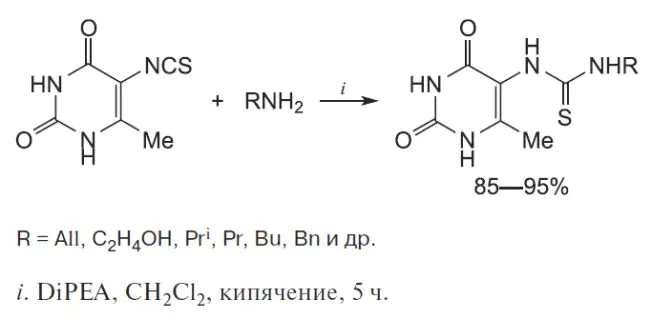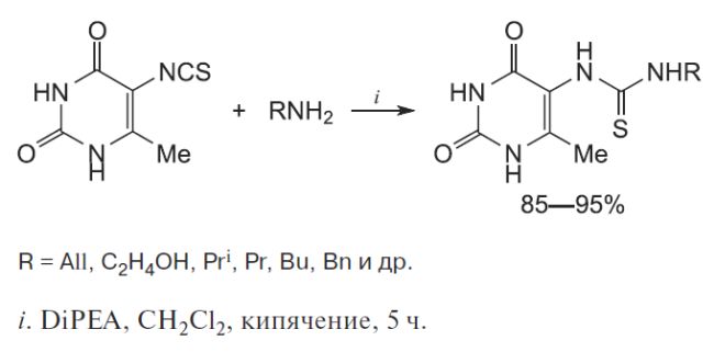 Изучено взаимодействие 5-изотиоцианато-6-метилурацила с аминами, в том числе природного происхождения, в CH2Cl2 в присутствии N,N-диизопропилэтиламина.