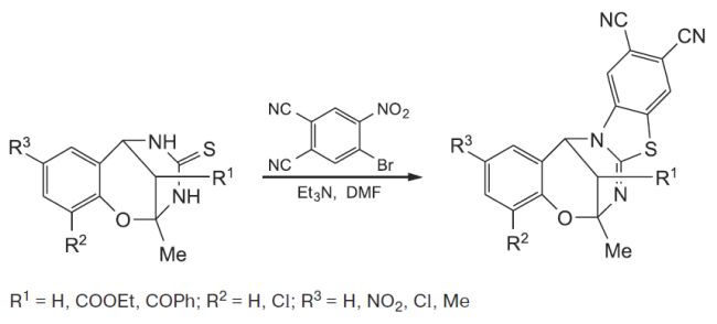 Синтезированы новые дицианосодержащие 6H,14H-6,14-метанобензо[g]бензо[4,5]тиазоло[2,3-d][1,3,5]оксадиазоцины путем взаимодействия 4-бром-5-нитрофталонитрила с S-содержащими трициклическими продуктами реакции Биджинелли на основе салициловых альдегидов и их структурными аналогами с выходами до 58%.