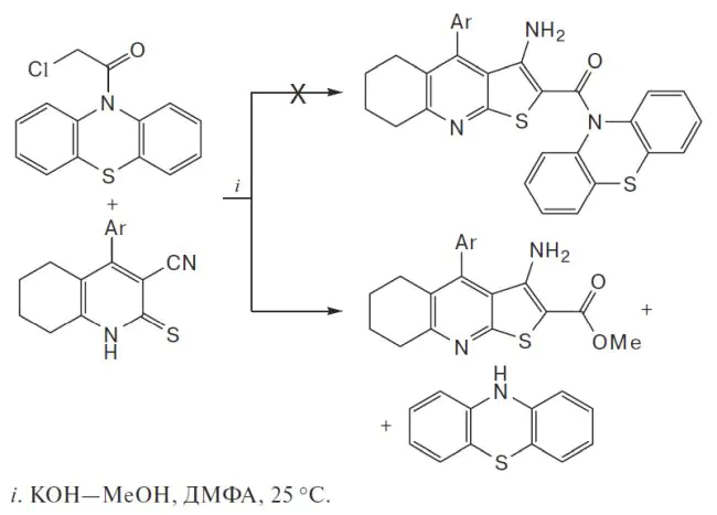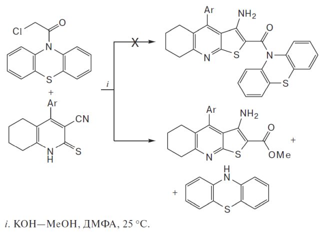 Реакция 10-(хлорацетил)фенотиазина с 4-арил-2-тиоксо-1,2,5,6,7,8-гексагидрохинолин-3-карбонитрилами в ДМФА в мягких условиях (25 °С, 1 ч, КОН—MeOH) приводит к образованию незамещенного фенотиазина и метиловых эфиров 3-амино-4-арил-5,6,7,8-тетрагидротиено[2,3-b]хинолин-2-карбоновой кислоты. Обсуждается возможный механизм реакции. Строение соединений подтверждено данными ИК- и ЯМР-спектроскопии, а также методом рентгеноструктурного анализа.