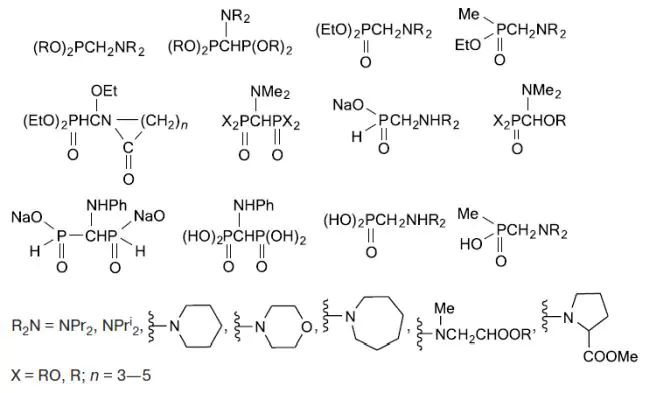 Разработаны удобные методы синтеза функционализированных моно- и бисфосфорсодержащих метиламинов и их производных, включающих фрагменты P—C—N и P—C(N)—P на основе аминоацеталей и их аналогов. Ваимодействие диалкоксифосфинов, диэтил(пивалоил)фосфонита, диэтилфосфита либо триметилсилиловых эфиров кислот трехвалентного фосфора с моно- и бисалкоксиметиламинами при катализе хлоридом цинка или эфиратом трехфтористого бора приводит к целевым продуктам с высокими выходами. Полученные вещества — функционализированные моно- и бисфосфорсодержащие метиламины — являются структурными аналогами аминокарбоновых кислот и природных пирофосфатов и могут представлять интерес как перспективные биологически активные вещества, водорастворимые полидентатные лиганды и эффективные экстрагенты.