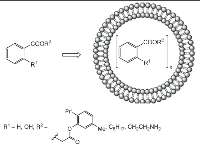 Синтезированы сложноэфирные производные бензойной и салициловой кислот, обладающие потенциальной антибактериальной и противогрибковой активностью. В качестве гидроксисодержащей составляющей при получении сложных эфиров были использованы производное природного биоцида тимола, этаноламин и октан-1-ол. Методом ультразвукового диспергирования получены пустые и нагруженные синтезированными соединениями липосомальные дисперсии. Оценку нагруженности липосомальных систем проводили с помощью УФ-спектроскопии, процент включения синтезированных соединений составил до 25 мас.%. Проведены первичные исследования биологической активности липосомальных форм конъюгатов in vitro в отношении Yarrovia lipolitica W29 и Bacillus subtilis 4419. Липосомальные формы конъюгатов ингибируют рост колоний бактерий в 10—100 раз эффективнее, чем исходные биоциды и свободные конъюгаты.