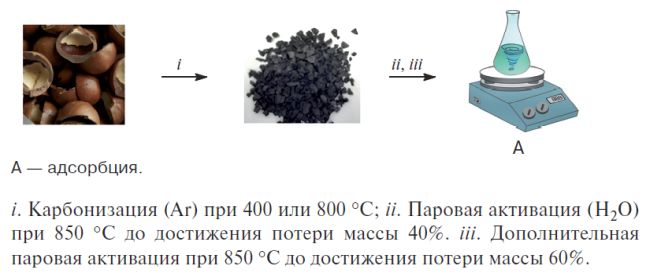 Получены образцы активного угля из скорлупы ореха макадамия. Изучены их текстурные параметры, адсорбционная способность и кинетика адсорбции из водной среды 2,4-дихлорфеноксиуксусной кислоты, типичного гербицида. С помощью физико-химических методов охарактеризованы основные стадии обработки возобновляемого сырья. Температура карбонизации позволяет регулировать адсорбционные и структурные параметры адсорбента. Образцы угля, карбонизованные в мягких условиях при 400 °C, отличаются большой удельной поверхностью, но медленным поглощением 2,4-дихлорфеноксиуксусной кислоты. При более жестких условиях карбонизации (800 °C) формируются образцы угля, у которых поверхность менее развита, но скорость сорбции гербицида значительно возрастает.