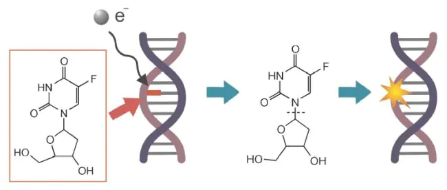 Для молекул потенциальных радиосенсибилизаторов 5-фторурацила и 5-фтор-2´-дезоксиуридина методом масс-спектрометрии отрицательных ионов резонансного захвата электронов изучены электронно-индуцированные реакции в газовой фазе в диапазоне энергий электронов 0—14 эВ. Измерены абсолютные сечения образования характеристичных отрицательных ионов. Для 5-фтор-2´-дезоксиуридина выявлено сходство реакций с таковыми в ранее исследованном тимидине. Отличительными особенностями 5-фтор-2´-дезоксиуридина являются его способность к образованию долгоживущих молекулярных отрицательных ионов со временем жизни относительно автоотщепления электрона 30 мкс и интенсивное образование осколочных ионов при энергиях электронов <3 эВ в результате разрыва гликозидной связи, что приводит к выбросу фрагмента сахара. Последний процесс может быть ответственен за радиосенсибилизирующие свойства 5-фтор-2´-дезоксиуридина. Предложена гипотеза о возможной роли обнаруженного процесса перегруппировочного выделения молекул HF в токсичности фторсодержащих радиосенсибилизирующих препаратов.
