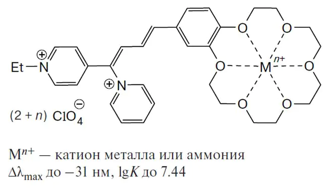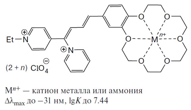 ЯМР 1H- и спектрофотометрического титрований, исследовано комплексообразование краунсодержащего красителя с катионами щелочных, щелочноземельных металлов и ионами аммония. Краунсодержащий бутадиенильный краситель проявляет высокую селективность и значительный оптический отклик при образовании комплексов с катионами кальция, стронция и бария.