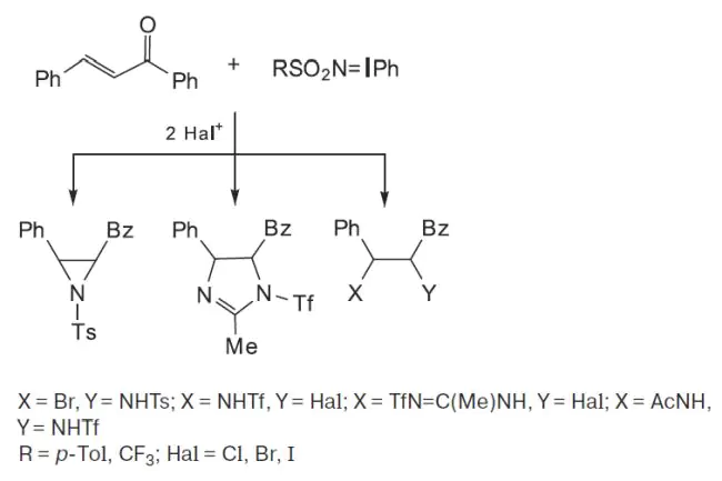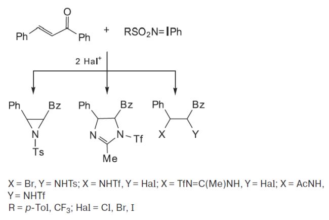 Направление реакций имино-λ3-иоданов PhI=NSO2R (R = CF3, 4-MeC6H4) с халконом зависит от природы используемого окислителя и растворителя. При использовании галогенсодержащих окислителей в зависимости от растворителя (ацетонитрил или хлористый метилен) был получен широкий ряд производных — галогенамиды, галогенамидины, 1,2-дизамещенный имидазолин, продукт 1,2-диаминирования.