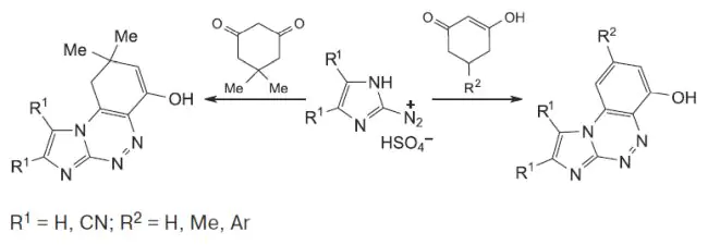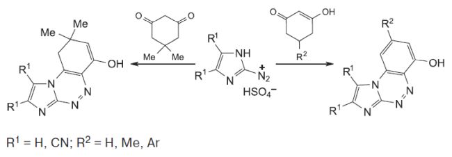 Новые бензо[e]имидазо[2,1-c][1,2,4]триазин-6-олы получены реакциями соли 1H-имидазол-2-диазония с циклогексан-1,3-дионами. Процесс протекает через стадию образования гидразонов, которые при воздействии кислот подвергаются внутримолекулярной циклизации с последующей окислительной ароматизацией. Природа заместителей в имидазольном фрагменте существенно влияет на ход превращений и оптимальные условия проведения реакции. При использовании димедона в качестве метиленактивного компонента возможно образование устойчивых таутомерных форм, стабилизированных электроноакцепторными группами, в частности цианогруппами в положениях 4 и 5 имидазольного цикла.