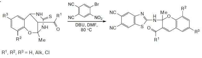 Разработан новый однореакторный метод синтеза 2-[N-(бензотиазол-2-ил)амино]-2H-хроменов при взаимодействии пиримидин-2-тионов с 4-бром-5-нитрофталонитрилом в присутствии DBU. Вводимые в реакцию трициклические соединения получены реакцией Биджинелли из салициловых альдегидов, 1,3-дикарбонильных соединений и тиомочевины.