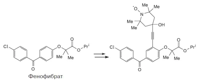 Фенофибрат является классическим препаратом для лечения гиперлипидемии и снижения уровня липопротеинов высокой плотности. Для изучения физико-химических свойств фенофибрата при наличии его спин-меченых аналогов можно использовать спектроскопию электронного парамагнитного резонанса (ЭПР). Описан синтез спин-меченого фенофибрата (Feno-SL), включающий стадии иодирования, кросс-сочетания Соногаширы и перекисного окисления. Методом ЭПР показано, что Feno-SL связывается с модельной липидной мембраной, приготовленной из пальмитоил-2-олеоил-sn-глицеро-3-фосфохолина. Степень мечения, определенная с помощью спектроскопии двойного электрон-электронного резонанса для Feno-SL в спиртовом стекле, близка к 100%. Данные спектроскопии модуляции огибающей спадов спинового эха при гидратации мембран тяжелой водой (D2O) показали, что средняя глубина погружения Feno-SL соответствует положению 5 атома углерода в липидной цепи.